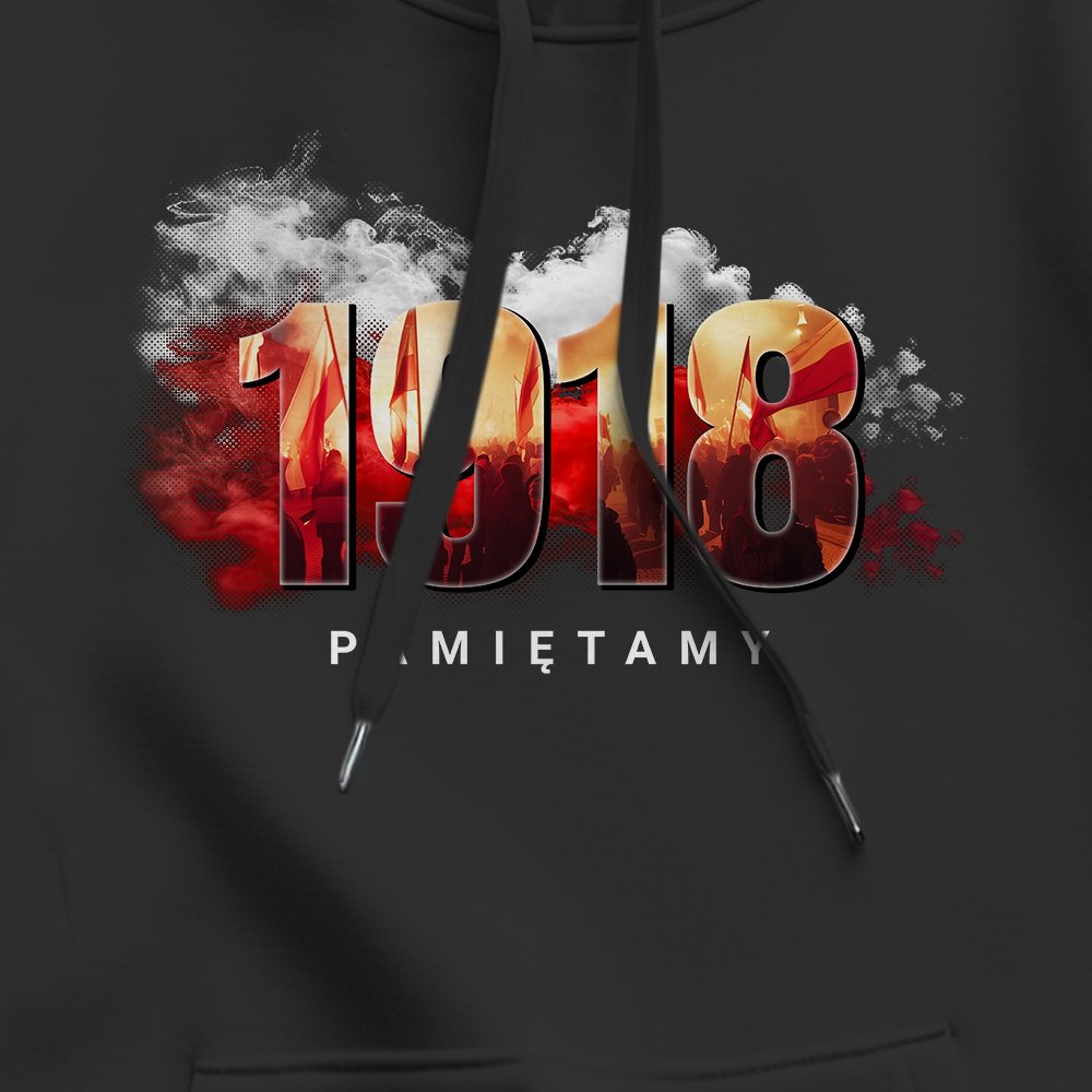 Na froncie bluzy znajduje się nadruk z napisem „1918 PAMIĘTAMY”, ozdobiony motywem dymu w barwach biało-czerwonych, symbolizujących walkę, wolność i polskie zwycięstwo.