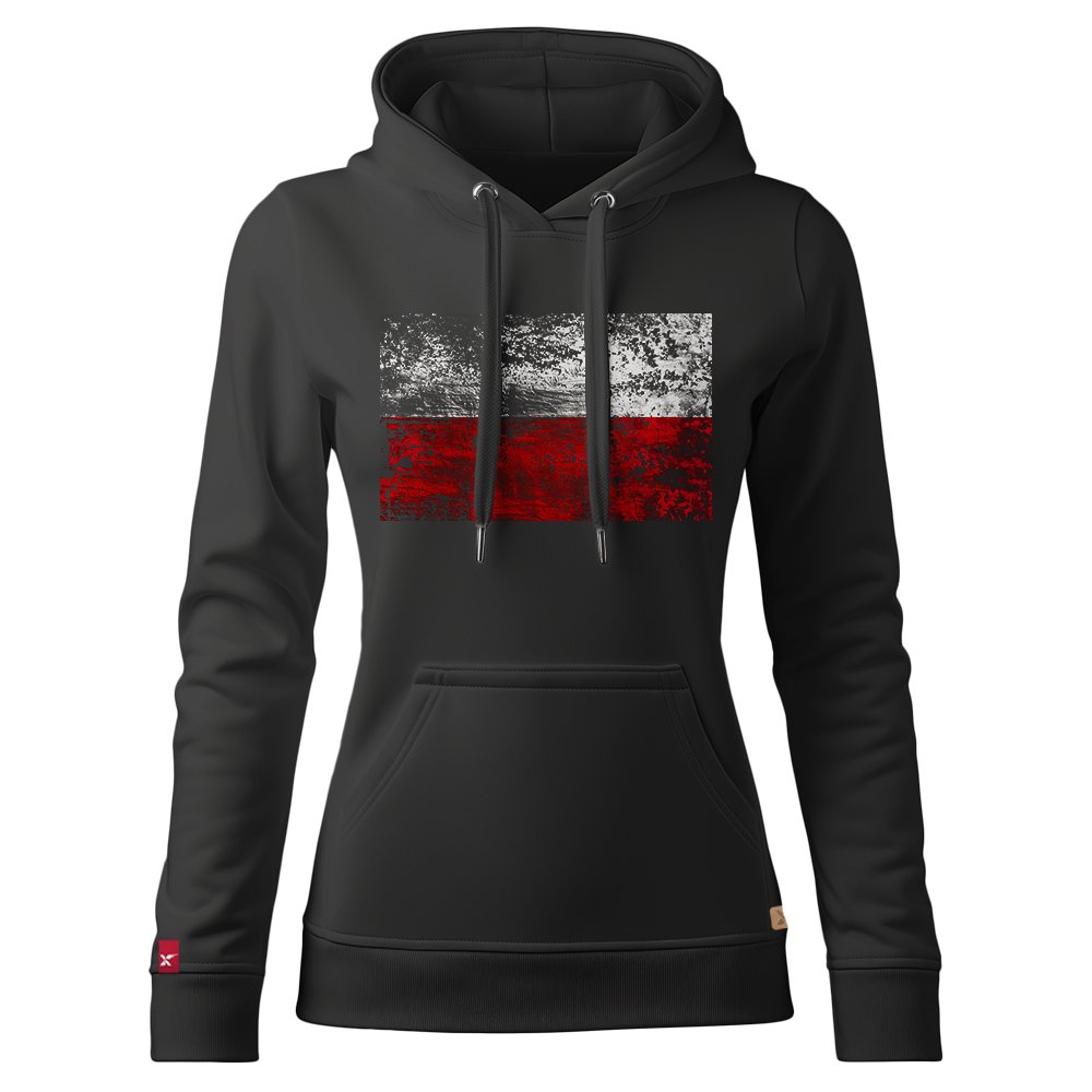 Czarna damska bluza patriotyczna z dużym nadrukiem Flagą Polski w stylu postarzanym. Bawełna premium, kobiecy krój, wyrazista symbolika narodowa w nowoczesnym wydaniu.