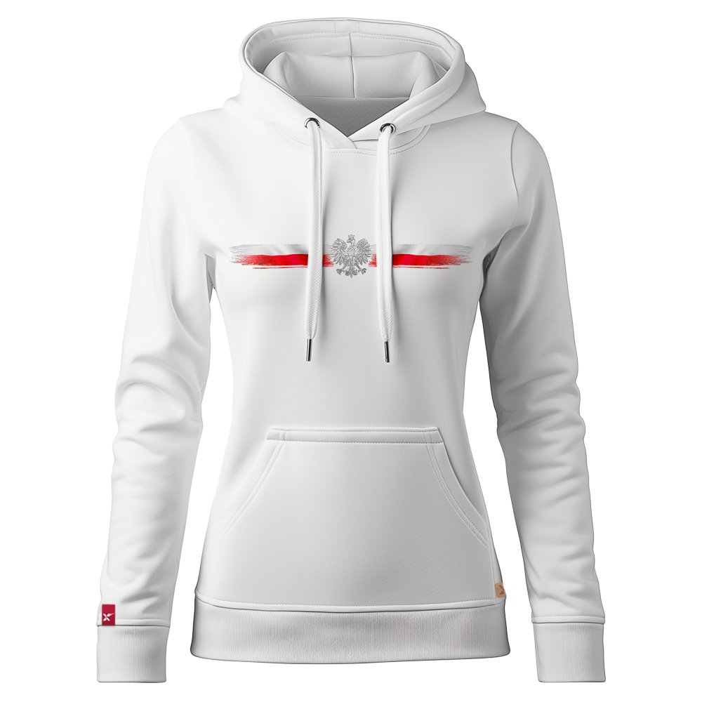 Biała damska bluza patriotyczna z poziomą flagą i orłem w koronie. Bawełna premium, minimalistyczny design, staranne wykończenie.