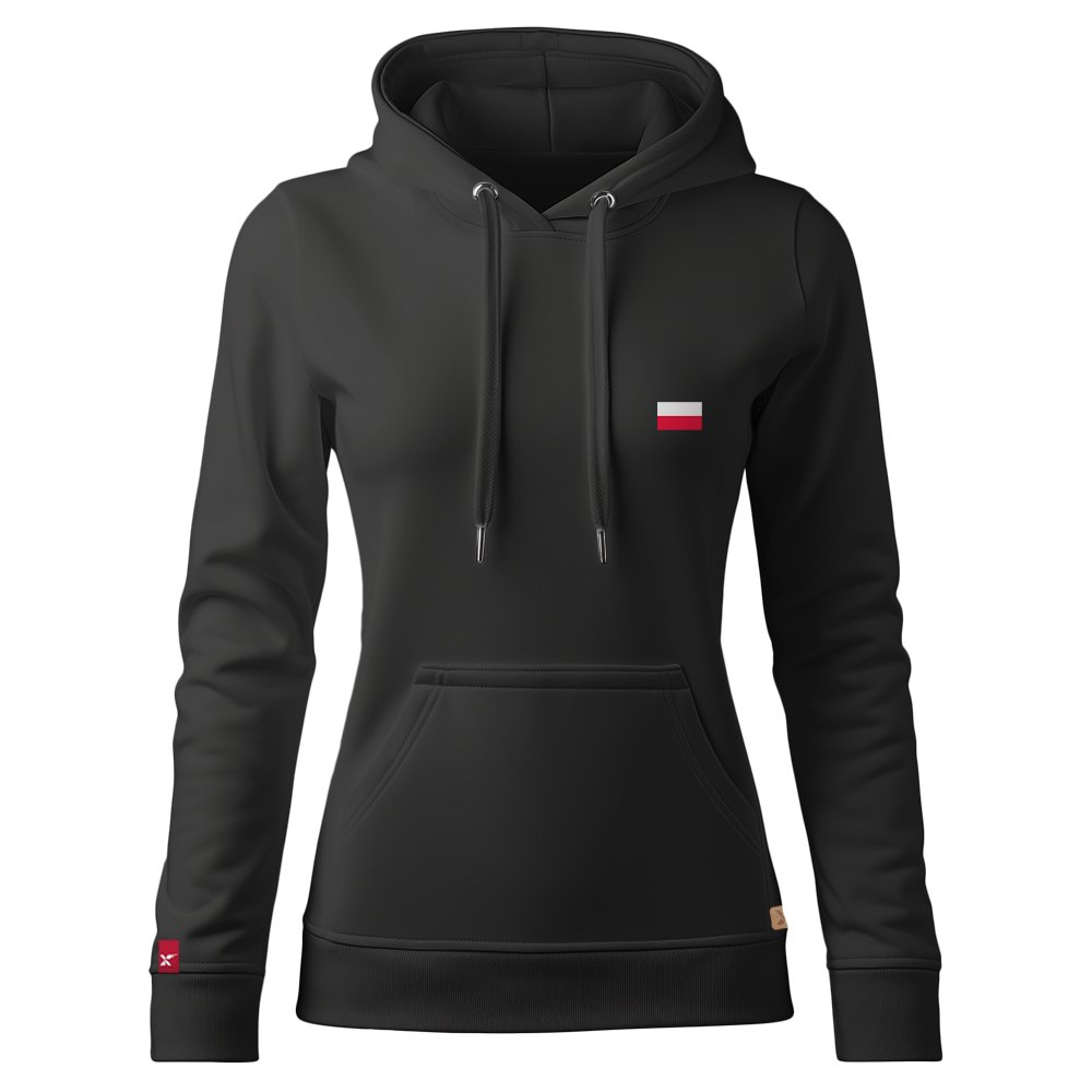 Czarna damska bluza patriotyczna z minimalistyczną małą flagą Polski na piersi. Bawełna premium, kobiecy krój, subtelna i elegancka forma patriotyzmu.