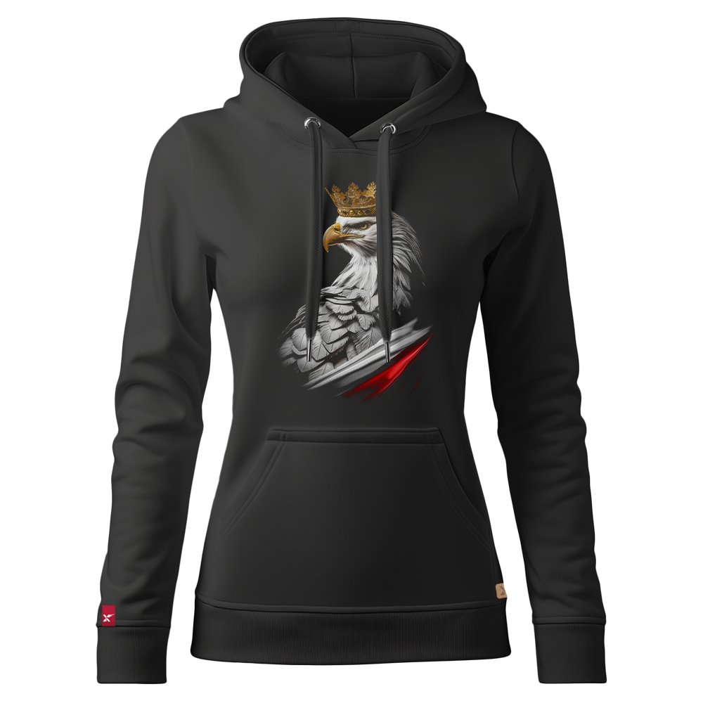 Czarna damska bluza patriotyczna z orłem w koronie i pionową flagą Polski. Nowoczesny design, symboliczny motyw, wygodny taliowany krój.