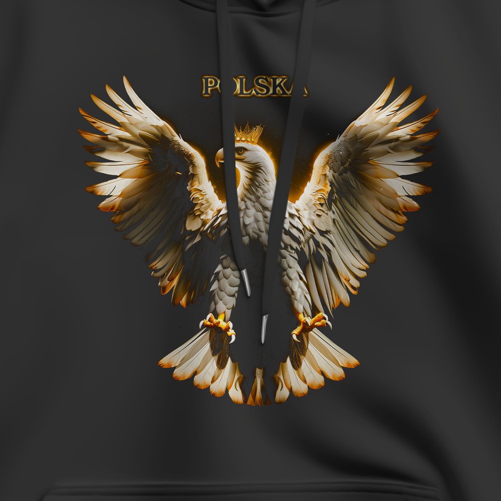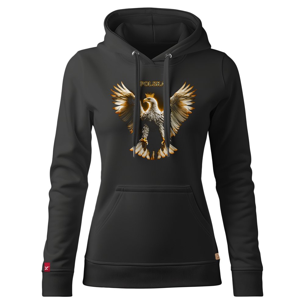 Czarna damska bluza patriotyczna z orłem w złocistej stylistyce i napisem POLSKA. Elegancki, symboliczny design dla kobiet ceniących wyrazisty styl narodowy.