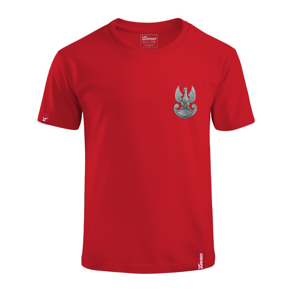 Na lewej piersi koszulki znajduje się charakterystyczny orzeł wojskowy w koronie na tarczy amazonek, będący symbolem honoru, odwagi i dumy narodowej. Stonowany, minimalistyczny wzór sprawia, że koszulka jest elegancka i ponadczasowa, idealna zarówno na co dzień, jak i na uroczystości patriotyczne.