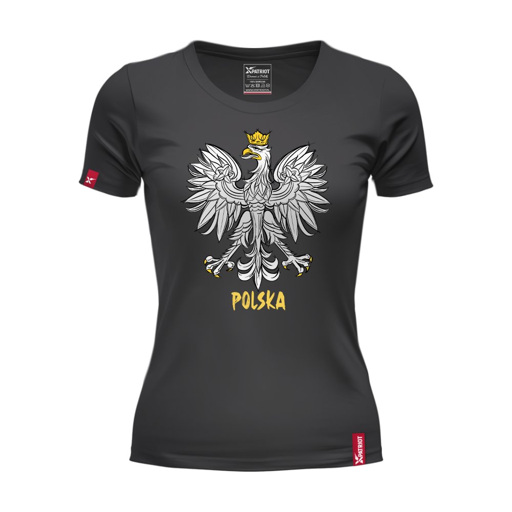 Damska czarna koszulka patriotyczna xPatriot z orłem w koronie i złotym napisem „Polska” – stylowa, wygodna i idealna na święta narodowe, uroczystości patriotyczne i codzienne noszenie.