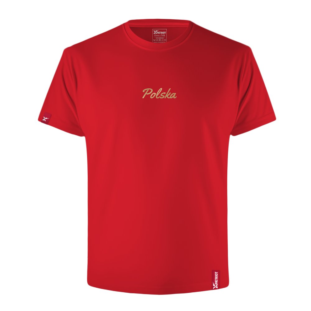 Męska czerwona koszulka patriotyczna xPatriot z napisem Polska w kolorze złotym. 100% bawełna, elegancki krój i najwyższa jakość dla prawdziwych patriotów.