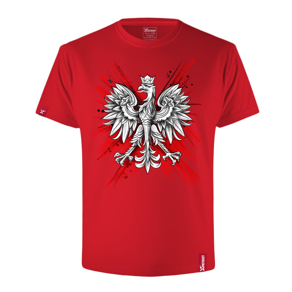 Czerwona męska koszulka patriotyczna xPatriot z orłem w koronie na artystycznym tle w barwach narodowych – stylowa, wygodna i idealna na uroczystości patriotyczne, wydarzenia sportowe i codzienne noszenie.