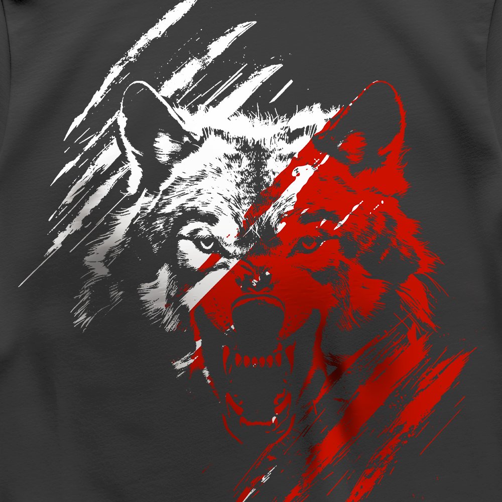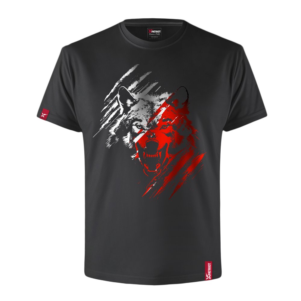 Na froncie koszulki umieszczono wyrazisty nadruk przedstawiający wilka – symbol odwagi, niezależności i wolności. Połowa wizerunku wilka wypełniona jest czerwienią nawiązującą do barw polskiej flagi, co podkreśla patriotyczny charakter projektu. Kontrast białych i czerwonych akcentów na tle głębokiej czerni nadaje koszulce energicznego i dynamicznego wyglądu.