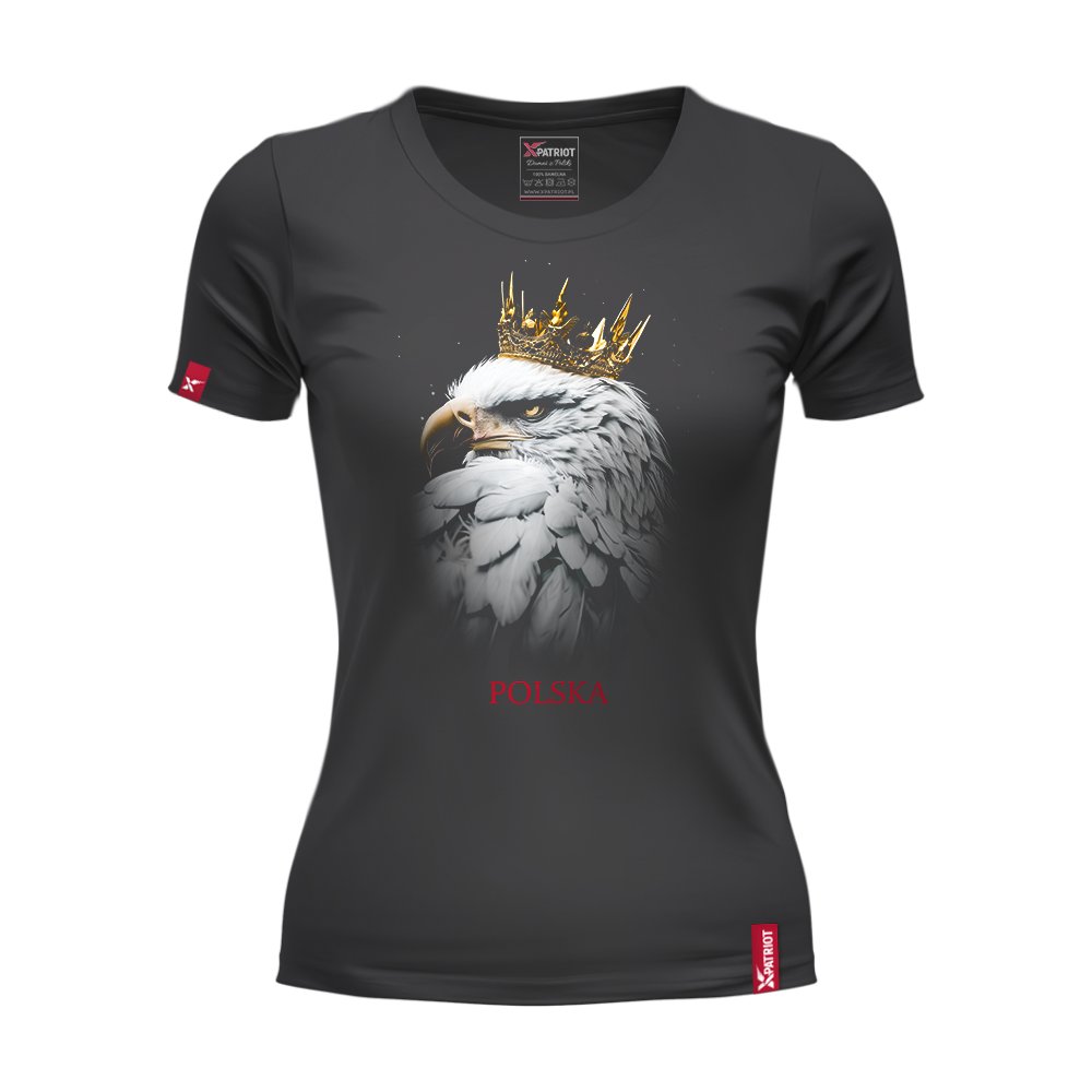 Czarna damska koszulka patriotyczna xPatriot z białym orłem w złotej koronie i napisem POLSKA. Bawełna premium, kobiecy slim fit – symbol siły i dumy narodowej.