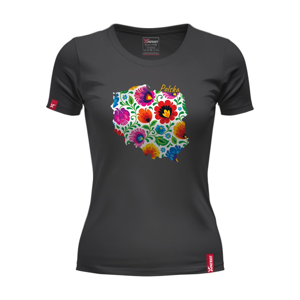 Czarna koszulka damska patriotyczna xPatriot POLSKA FOLK z nadrukiem mapy Polski w kolorowe folkowe wzory. Stylowa, bawełniana, wygodna – idealna na co dzień i wyjątkowe okazje.