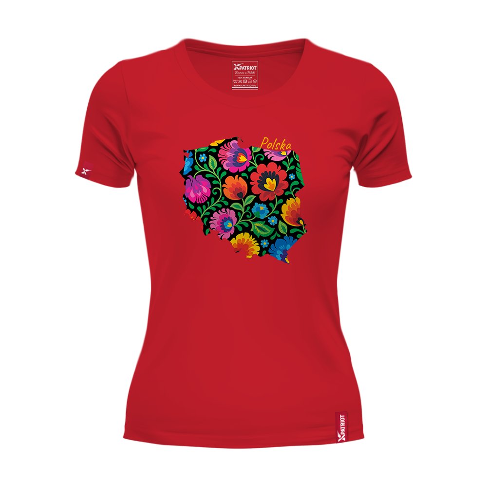 Czerwona koszulka damska patriotyczna xPatriot POLSKA FOLK z mapą Polski w folkowe wzory kwiatowe. Stylowa, wygodna, bawełniana – idealna na co dzień i wyjątkowe okazje.