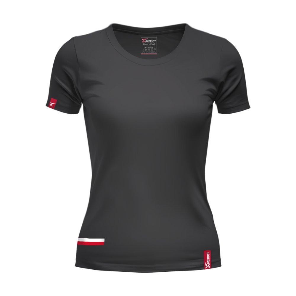 Damska koszulka patriotyczna xPatriot w kolorze czarnym z biało-czerwoną flagą. Wygodna, 100% bawełna, minimalistyczny styl i wysoka jakość wykonania.