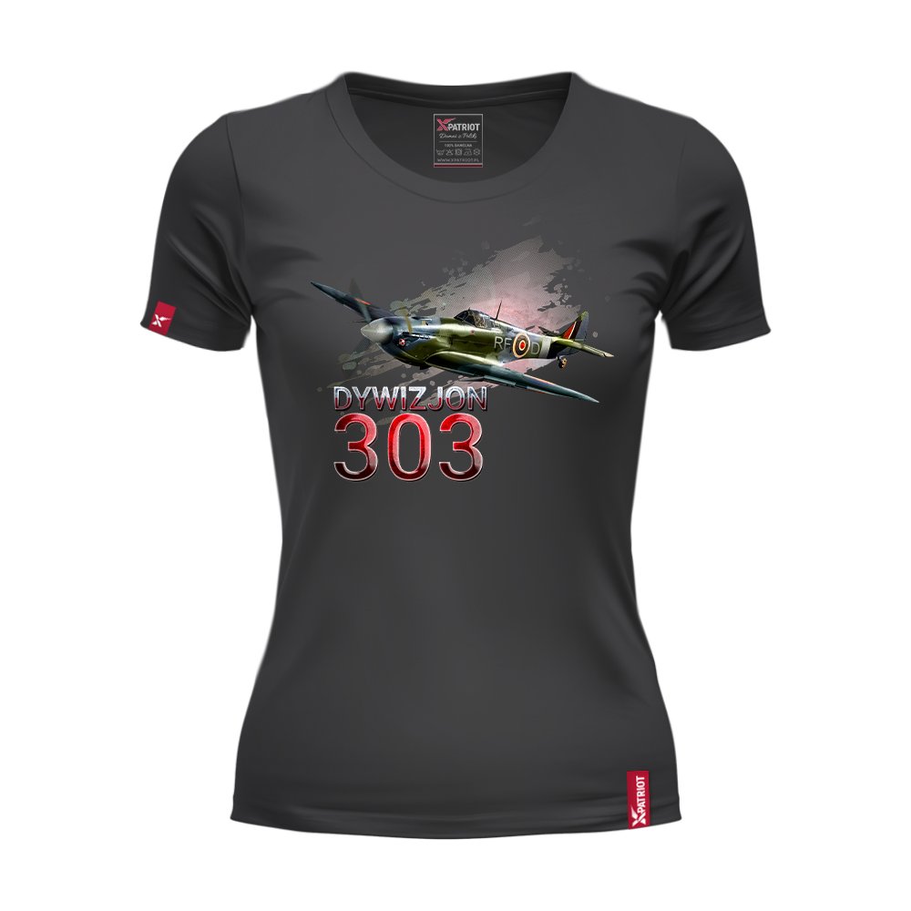 Czarna damska koszulka patriotyczna xPatriot Dywizjon 303 – realistyczna grafika Spitfire, napis Dywizjon 303. Stylowa, wygodna i hołdująca polskim bohaterom.