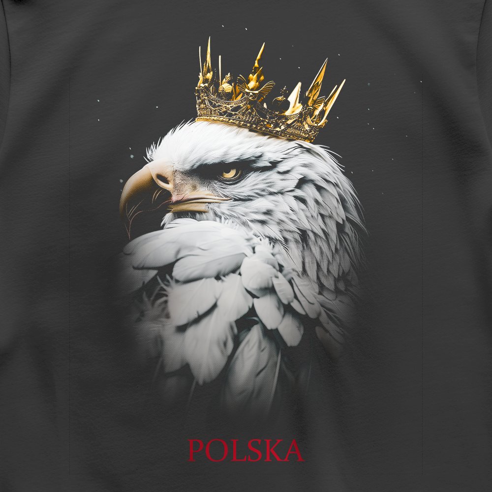Model zdobi imponujący nadruk białego orła z szarym konturem i złotą koroną, symbolizujący niepodległość i honor.
